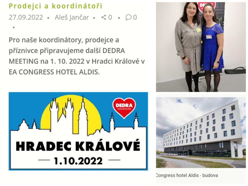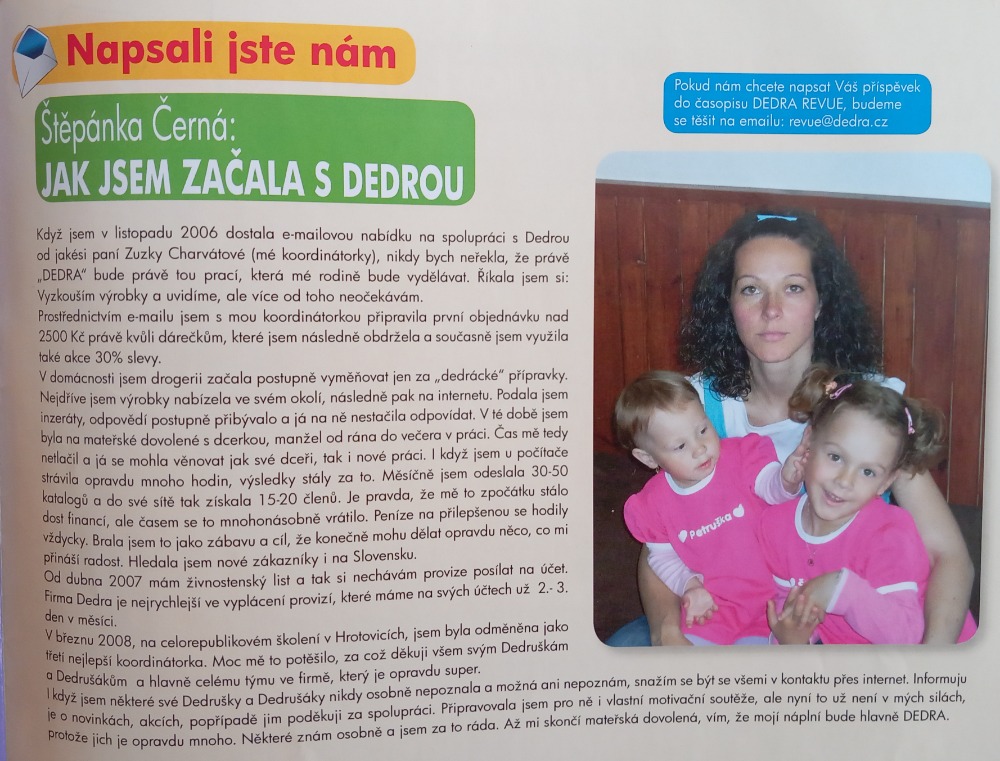 Některé své dedrušky a dedrušáky jsem nikdy osobně nepoznala a možná ani nepoznám, ale snažím se všemi být v kontaktu. Informovat je o novinkách, akcí, informací, popřípadě jim poděkovat za spolupráci. Připravovala jsem pro ně i motivační soutěže, ale nyní to už není v mých silách, protože jich je opravdu mnoho. Některé znám osobně a jsem za to ráda. Snažím se získávat nové zákazníky i nadále, ale je to už složitější, počet členů se rozrůstá a já už na to také nemám tolika času, kolik bych potřebovala a chtěla. Nyní jsem ještě na MD s druhou dcerkou. Až mi MD skončí, vím, že mojí náplní bude hlavně DEDRA.